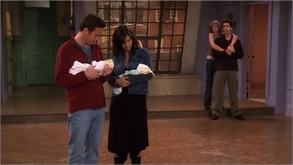- Courteney Cox was pregnant during this episode and hid her pregnancy bump with loose clothing and props throughout the episode. However, it was so obvious that she was pregnant in the scenes where Monica left for the bathroom in the hospital and when she and Chandler bring the babies home.