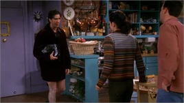 - Ross is standing when talking about leather pants with fringe all down the sides. In the reaction shot of Chandler, he is sitting down. Then when they cut back to Ross, he is standing again.